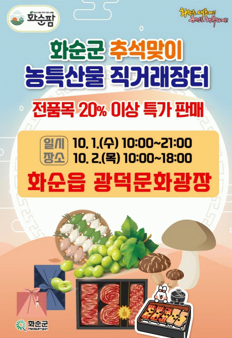 이번 장터에는 화순팜 우수 입점업체 30개가 참여하며, 업체 자체 할인과 더불어 군에서 20% 할인 지원을 추가로 제공해 군민들은 최소 20% 이상, 일부 품목은 최대 40%까지 저렴하게 지역 농·특산물을 구매할 수 있다.