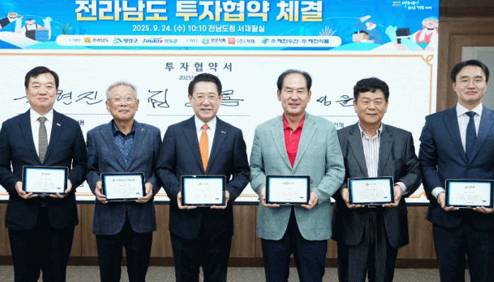 이날 협약식에는 김영록 전남도지사를 비롯해 육현진 ㈜성경식품 대표, 김성윤 ㈜거해 대표, 임한택 ㈜해진수산·㈜해진식품 대표, 김희수 진도군수, 윤재광 영암부군수 등이 참석했다.