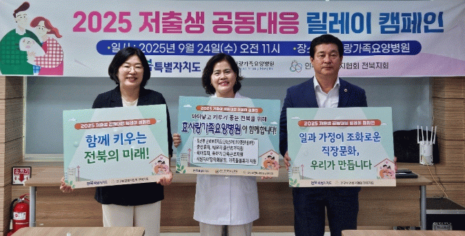 도는 9월 24일 전주시 완산구에 위치한 효사랑가족요양병원에서 여섯 번째 저출생 공동대응 릴레이 캠페인을 개최하고, 가족친화형 직장문화의 사례를 공유하며 현장 중심의 정책 개선 방안을 모색했다.