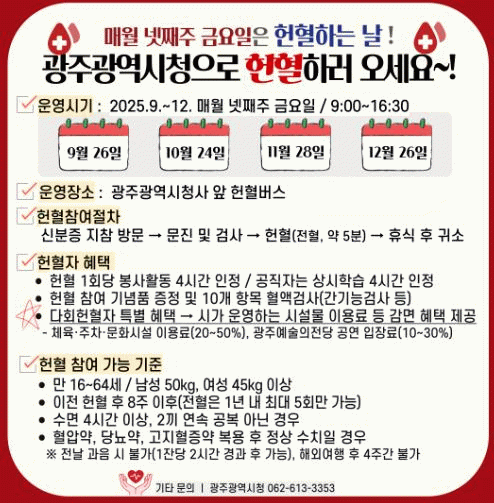 광주시는 올해 9월부터 12월까지 매월 넷째 주 금요일을 ‘헌혈 참여의 날’로 정하고, 대한적십자사 광주·전남혈액원과 협력해 오전 9시부터 오후 4시30분까지 청사 앞 시민광장에 헌혈버스를 배치·운영한다.