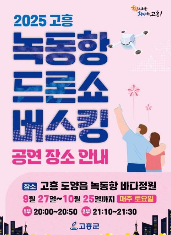 지난 9월 20일까지 녹동항 클린 어항 조성 공사로 인해 다른 장소에서 진행됐던 녹동항 드론쇼 버스킹 공연이 오는 9월 27일부터는 다시 기존 장소인 녹동항 바다정원에서 다시 열린다.