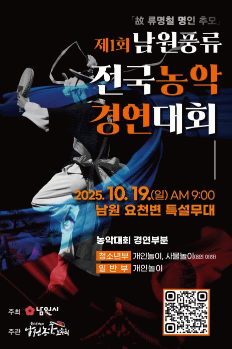 최경식 남원시장은 “남원풍류 전국농악경연대회가 전통 농악을 계승하고 청소년부터 성인까지 모두가 참여하는 문화축제로 자리매김할 것”이라며 “농악의 본향 남원이 문화적 위상을 더욱 공고히 할 수 있도록 다양한 지원을 이어가겠다”고 밝혔다.