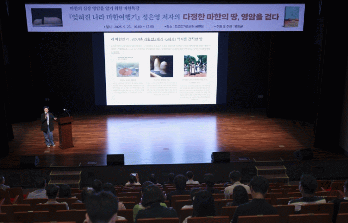 '잊혀진 나라 마한 여행기'의 정은경 작가가, 영암군이 23일 한국트로트가요센터에서 개최한 특강에서 ‘영암 마한’의 중요성을 강조했다.