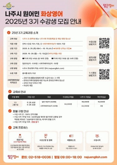 원어민 화상영어 3기 수업은 나주시 초·중학생 또는 나주시에 주민등록을 둔 해당 나이 청소년 대상으로 일반학생 535명, 사회적 배려 학생(수급자, 한부모가족의 청소년, 3자녀 이상 다자녀가정, 차상위 계층) 50명을 선착순으로 모집한다.