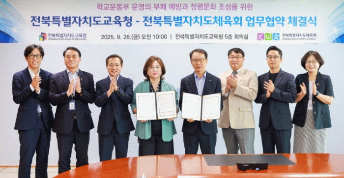 전북교육청은 26일 본청 5층 회의실에서 전북체육회와 ‘학교운동부 운영의 부패 발생 위험 발굴·개선 및 청렴한 학교 체육 문화를 조성하기 위한 업무협약(MOU)’을 체결했다고 밝혔다.