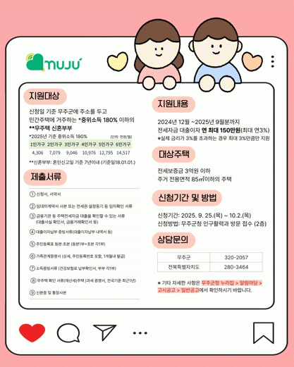 지원 대상은 무주군에 거주하며 혼인신고일 기준 7년 이내인 무주택 신혼부부 중 기준 중위소득 180% 이하 가구로, 연 최대 150만 원, 대출금리 연 최대 3% 한도로 전세자금 대출이자를 지원한다.
