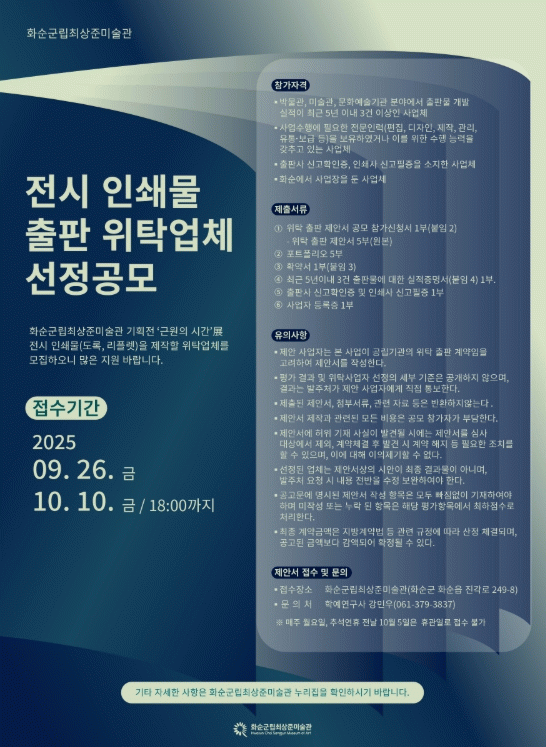 강삼영 문화예술과장은 “이번 기획전시 ‘근원의 시간’ 展은 외적·내적 근원을 탐구하는 의미 있는 전시인 만큼, 인쇄물 제작에서도 전문성과 창의성을 겸비한 업체를 찾고 있다”라며, “전시의 깊이를 효과적으로 전달할 수 있는 역량 있는 업체의 많은 참여를 기대한다”라고 전했다.