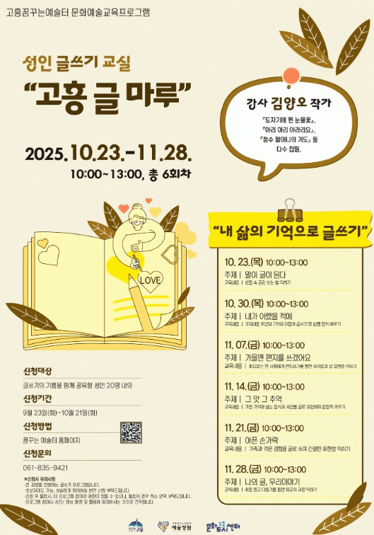 이번 프로그램은 고흥의 중장년층을 대상으로, 평범한 일상 속 경험을 글로 풀어내고 서로의 이야기를 나누는 과정을 통해 자존감과 성취감을 높이는 것을 목표로 한다.