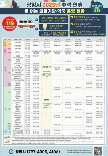 상하수도 및 안전 관련 민원은 전문업체와 협력해 원활히 처리하며, 시민 편의를 위해 병·의원 및 약국 운영 일정과 생활민원 관련 정보는 광양시 홈페이지에 공개된다.