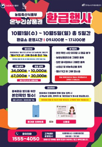 고객은 행사 기간에 지정 시장 내 ‘온누리상품권 환급행사 참여 점포’ 안내판이 부착된 점포에서 국산 농축·수산물을 구입한 후, 환급소를 방문해 구매 영수증 또는 모바일 결제 화면을 제시하면 구매 금액의 최대 30%를 온누리상품권으로 돌려받을 수 있다.