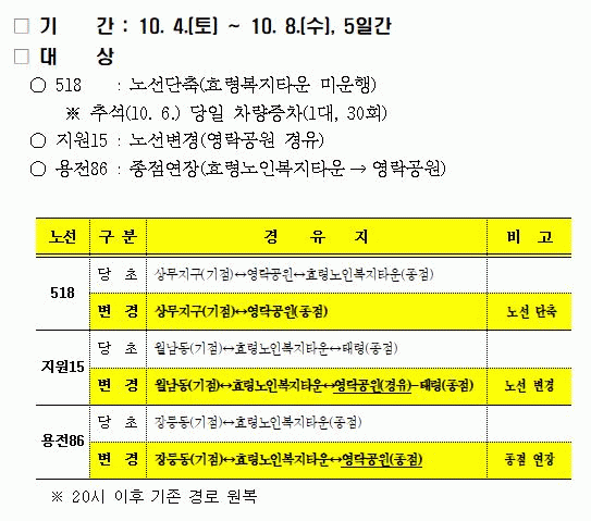 상무지구~종합버스터미널~영락공원을 운행하는 518번 시내버스는 추석 당일(6일) 30회 증차 운행하고, 월남동~태령을 운행하는 지원15번은 영락공원을 경유해 운행한다.