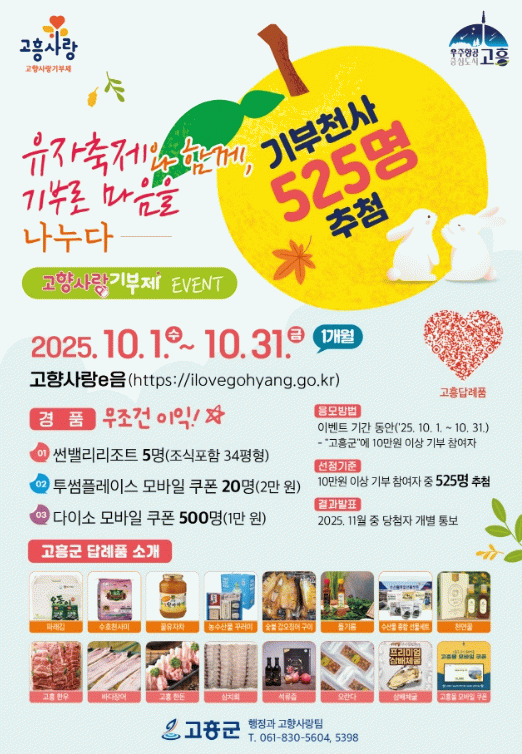 이벤트 기간(10.1~10.31) 중 고흥군에 10만 원 이상 기부한 참여자는 자동 응모되며, 추첨을 통해 총 525명에게 푸짐한 선물이 제공된다. 경품은 ▲고흥 썬밸리 숙박권(조식 포함, 36평형) 5명 ▲투썸플레이스 모바일 음료 쿠폰(2만 원권) 20명 ▲다이소 모바일 상품권(1만 원권) 500명이다.