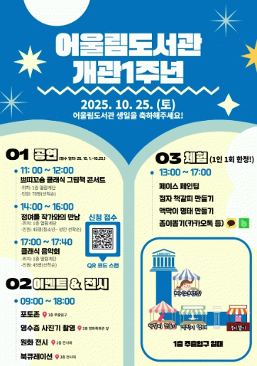주요 행사로는 남녀노소 누구나 즐길 수 있도록 ▲그림책 콘서트(11시) ▲정여울 작가와의 만남(14시) ▲클래식 음악회(17시) 등 다양한 공연이 1층 열람계단에서 진행되고,