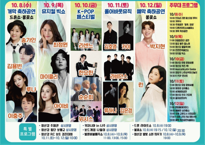 이번 축제는 5일간 이어지는 다양한 공연과 체험 프로그램을 통해 나주의 역사와 문화를 알리고, 영산강의 아름다움을 예술로 풀어낸다. 무엇보다도 송가인, 최정원, 마이클 리, 아이비, 김호영, 카이, 린, 박지현 등 국내 최정상급 아티스트와 K-POP 스타들이 총출동해 ‘레전드 라인업’으로 손꼽히는 이번 영산강축제는 그 어느 해보다 큰 관심을 끌고 있다.