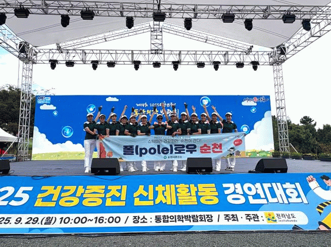 순천시 대표 ‘폴(Pole)로우 순천’ 팀은 노르딕 워킹 리더들이 자발적으로 구성한 팀으로, 노르딕 폴(Pole)을 활용한 체조, 스트레칭, 워킹 스텝을 결합한 화려한 군무 퍼포먼스를 선보여 관람객들의 뜨거운 박수와 호응을 받았다.