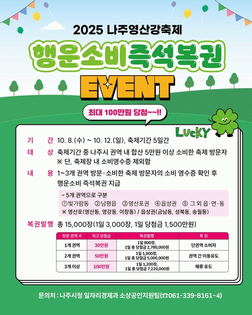 나주시 관계자는 “축제를 즐기면서 지역 상권도 살리고 행운의 주인공이 될 기회”라며 “많은 시민과 관광객의 적극적인 참여를 바란다”고 말했다.