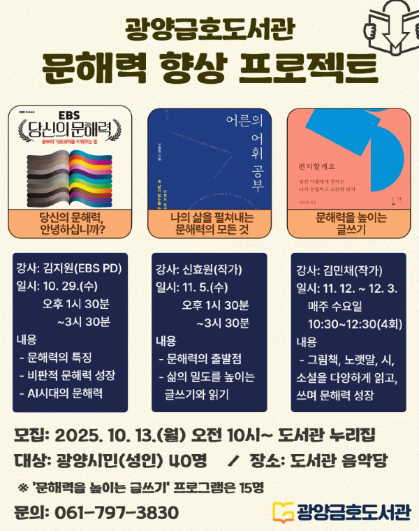 참여 신청은 오는 10월 13일 오전 10시부터 광양시립도서관 누리집을 통해 선착순 접수할 수 있으며, 자세한 일정과 내용은 광양시립도서관 누리집을 확인하거나 금호도서관으로 문의하면 된다.
