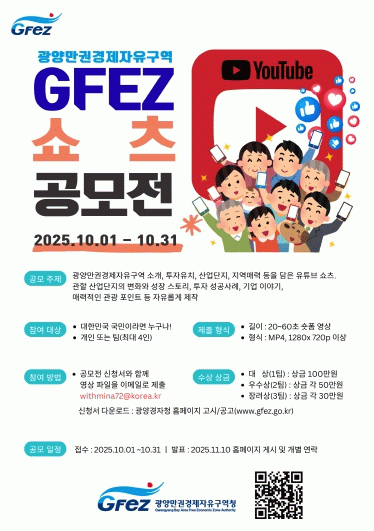 공모 주제는 △광양만권 산업단지 변화와 성장 스토리 △투자 성공사례와 기업 이야기 △여수·순천·광양·하동의 관광 매력과 특산물 등을 포함한 자유주제이며, 대한민국 국민이라면 누구나 응모할 수 있다. 형식은 20~60초 분량의 쇼츠 영상으로 제작 과정에서 AI 이미지·영상·음원 활용도 가능하다.