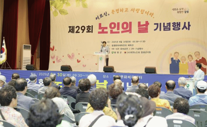 함평군은 2일 “제29회 노인의 날’ 기념행사가 지난달 30일 함평문화체육센터에서 “어르신! 존경하고 사랑합니다”라는 주제로 성대히 개최됐다“고 밝혔다.