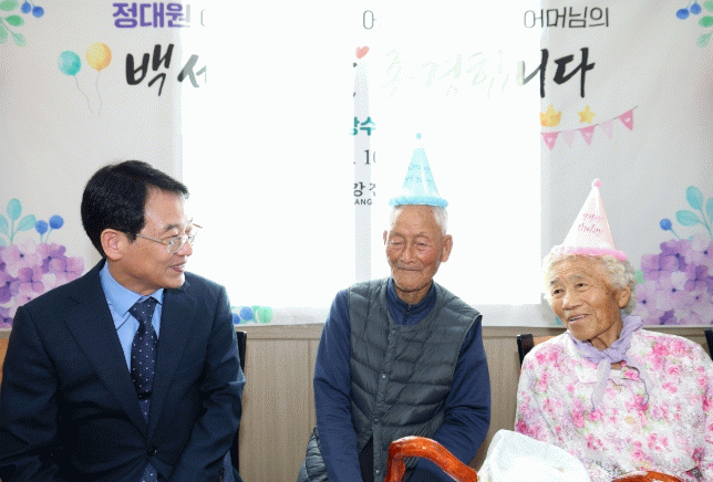 이날 100세 어르신께 드리는 청려장과 함께 과일·참치세트 등 위문품을 전달했으며, 케이크 커팅과 기념촬영을 통해 참석자 모두가 어르신들의 장수를 축하하는 시간을 가졌다.