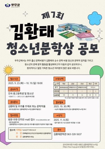 접수는 오는 19일(18:00)까지 방문 및 우편(전북특별자치도 무주군 무주읍 최북로15 김환태문학관), 전자우편을 이용하면 된다.
