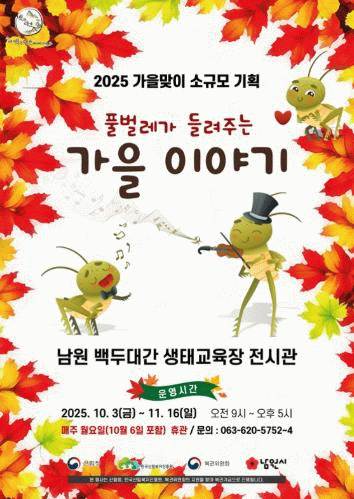 특히 남원 지리산 청정지역에서 발견되는 반딧불이, 방아깨비, 왕귀뚜라미 등 가을철 곤충들을 만나볼 수 있다.
