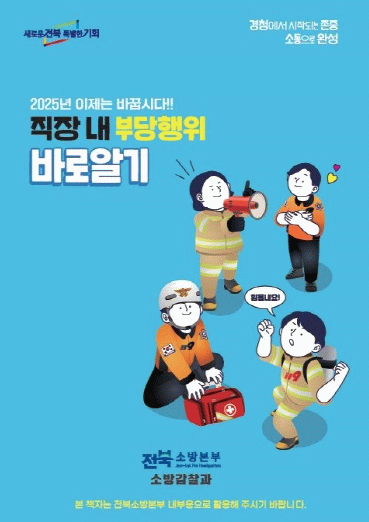 책자의 주요 내용은 ▲ 부당행위의 정의와 판단 기준 ▲ 2025년 상반기 전북소방 구성원 설문 결과 분석 ▲ 유형별 사례와 판례 소개 ▲ 자가진단 체크리스트와 징계 양정 안내 ▲ 국가별 부당행위 유형 비교와 향후 계획 등으로 구성됐으며, 국내외 사례를 비교하면서 앞으로 소방본부가 추진할 소통 강화와 부당행위 예방 계획을 소개했다.