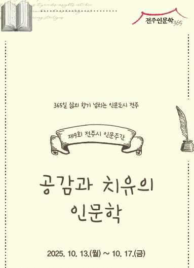 시는 오는 13일부터 17일까지 5일간 전주시평생학습관 등 전주시 일원에서 인문학 대중화를 위한 ‘제9회 전주시 인문주간’을 운영한다고 9일 밝혔다.