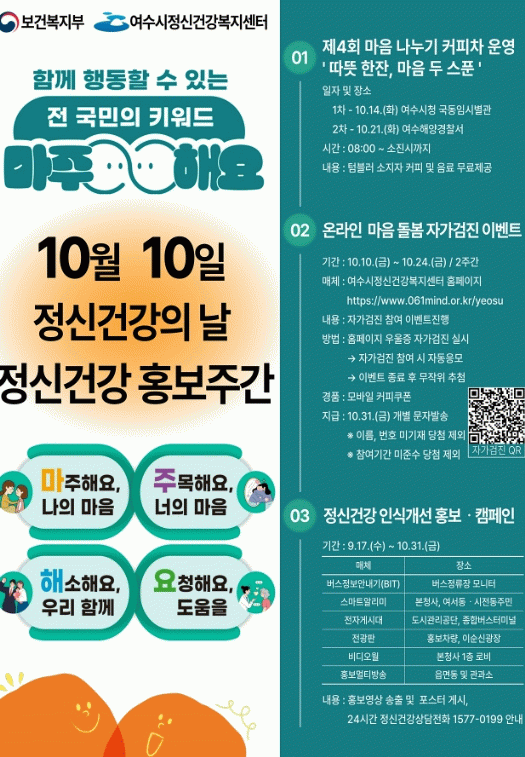 여수시 보건소 관계자는 “정신건강은 누구에게나 중요한 문제이며 함께 지켜야 할 부분”이라며 “이번 홍보주간을 통해 시민들이 마음 건강의 소중함을 되새기고 도움이 필요할 때 주저하지 않고 상담을 요청할 수 있는 사회 분위기가 확산되길 바란다”고 말했다.