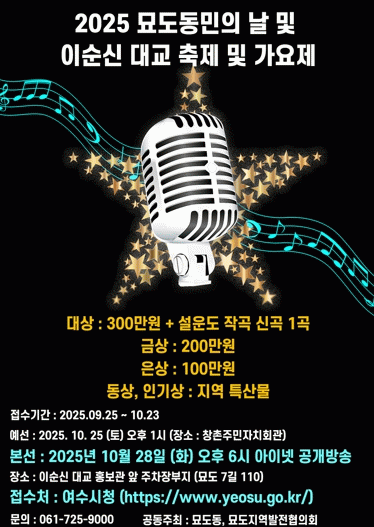 올해 처음으로 개최되는 이순신대교 가요제는 전국의 가수 지망생들이 참가해 실력을 겨루는 미래 스타 발굴 무대로 주목받고 있다. 참가 접수기간은 오는 10월 23일까지이며, 예선은 10월 25일 오후 1시 창촌주민자치회관에서, 본선은 10월 28일 오후 6시 축제 무대에서 열린다.