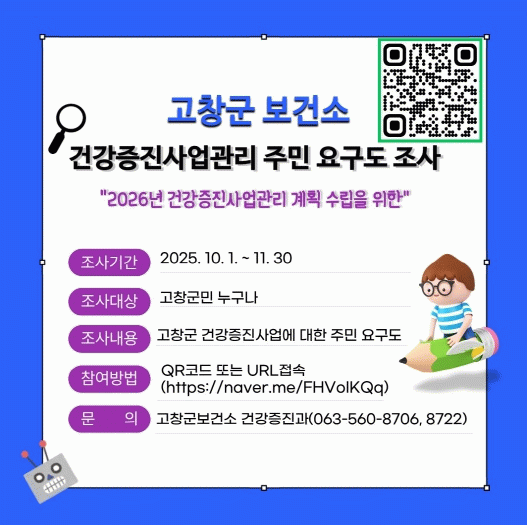 유병수 보건소장은 “주민들이 필요로 하는 건강증진 프로그램에 대한 의견을 수렴하여 지역 맞춤형 건강증진사업을 추진하기 위한 조사인 만큼 많은 군민들이 적극적으로 참여해주길 바란다“고 말했다.