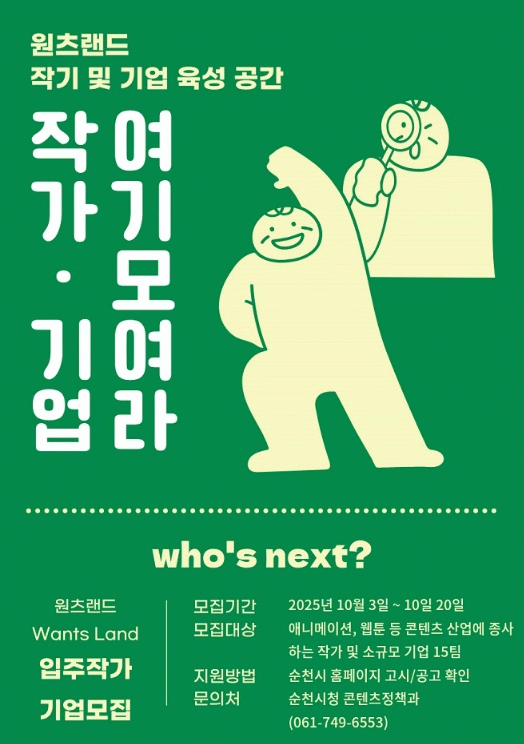 이번 모집은 애니메이션, 웹툰 등 문화콘텐츠 분야에서 활동 중이거나 창작을 준비 중인 예비․기성작가와 소규모 기업 15개 팀을 대상으로 진행된다.