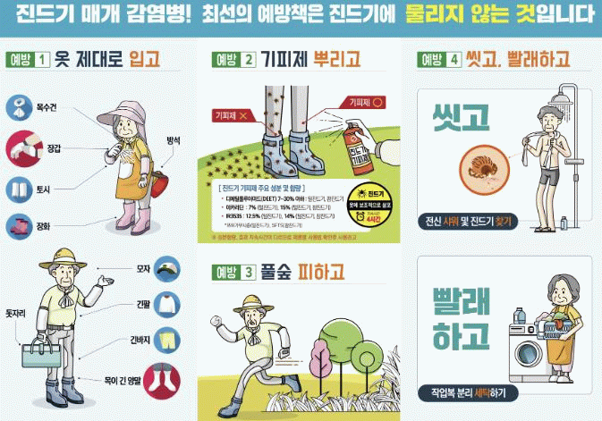 또한 진드기 기피제를 사용하고, 야외활동 후에는 입은 옷을 세탁하고 바로 샤워하는 것이 좋다.