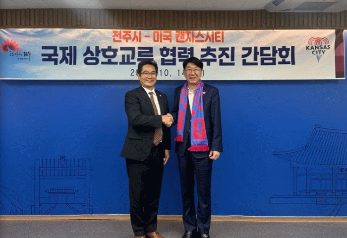 시는 14일 전주를 방문한 캔자스시티 한인회장단이 양 도시 간 문화·스포츠·경제 분야 협력 강화의 뜻을 담은 캔자스시티 시장의 공식 교류 희망 서한을 우범기 전주시장에게 전달했다고 밝혔다.