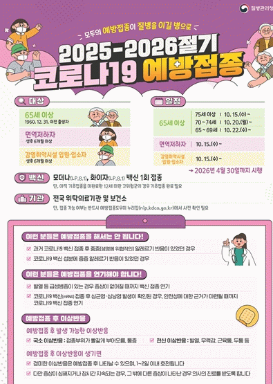 접종대상은 고위험군으로 △65세 이상(1960.12.31. 이전 출생자) △면역저하자 △감염취약시설 입원·입소자를 대상으로 진행된다. 사용되는 백신은 질병관리청 예방접종전문위원회 심의를 통해 확정된 신규 백신인 LP.8.1 백신이다.