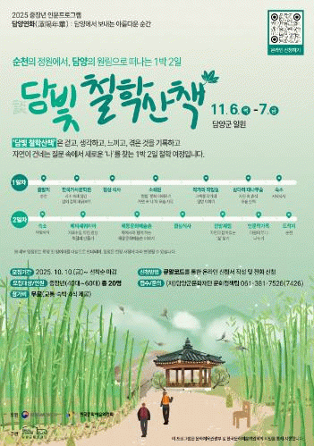재단 관계자는 “이번 담빛 철학산책은 담양의 자연과 예술, 인문정신을 경험하며 자기 성찰과 자유의 여정을 경험할 수 있는 소중한 기회가 될 것”이라며 “많은 중장년이 참여해 삶의 쉼표를 찾길 바란다.”고 전했다.