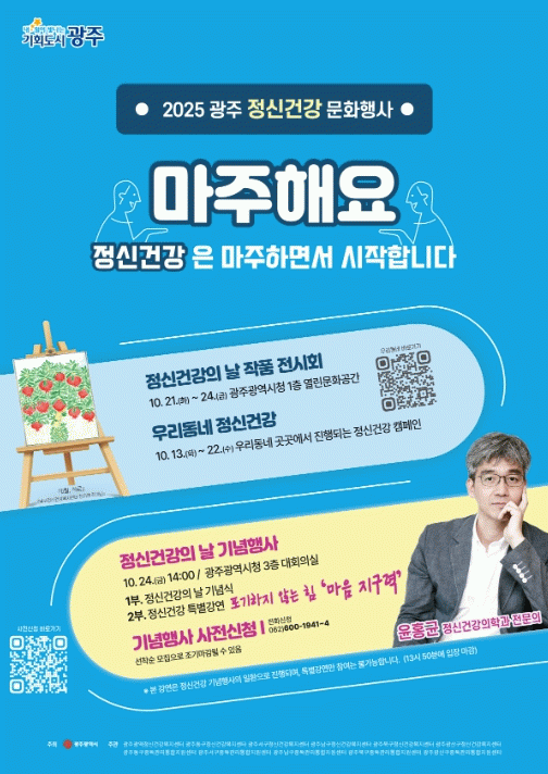 광주광역시가 주최하고 광주광역정신건강복지센터와 5개 자치구 정신건강복지센터, 중독관리통합지원센터가 공동 주관해 열리는 이번 행사는 ‘정신건강은 마주하면서 시작합니다’를 주제로 시민과 함께하는 다양한 프로그램을 선보인다.