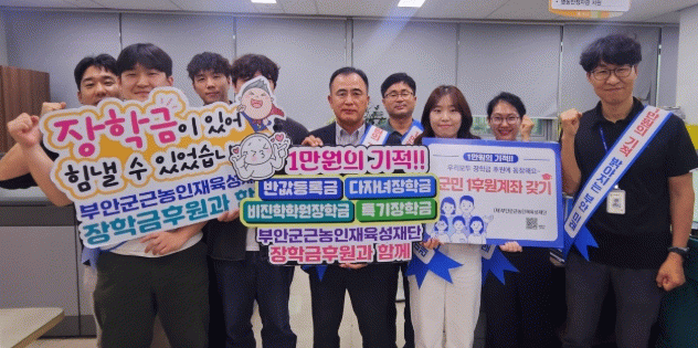 한편, (재)부안군근농인재육성재단은 1만원의 기적,『장학금 1군민 1후원계좌 갖기』 범군민 후원 독려 운동을 통해 건전한 장학기금을 확보하고, 대학 반값등록금, 대학비진학자 창업‧취업 지원금 등 실속있는 장학 정책을 통해 지역 청년들의 미래를 응원해나가고 있다.