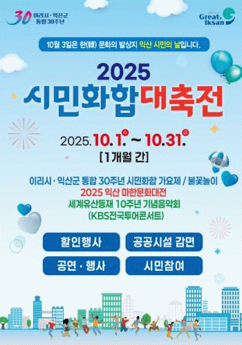 익산시는 이리시·익산군 통합 30주년을 기념해 10월 한 달간 시민들이 일상에서 문화와 여가를 즐길 수 있는 '시민화합대축전'을 이어가고 있다.