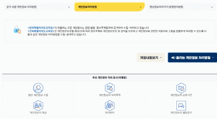 이를 통해 도교육청 누리집 내 개인정보 처리방침 및 관련 안내 전체를 음성으로 들을 수 있으며, 사용자가 ‘읽어보기’ 버튼을 누르면 자동으로 음성이 재생된다.