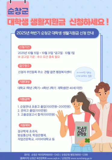 순창군 대학생 생활지원금 지원사업은 민선8기 순창군 보편적 복지정책의 핵심사업이다. 대학 생활비와 주거비 등 교육 관련 경제적 부담을 덜어주고, 지역 인재의 고등교육 기회를 보장해 우수 인재를 양성하기 위해 마련됐다.
