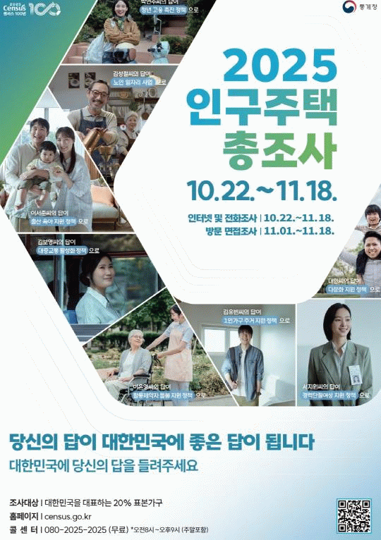 인구주택총조사는 5년마다 실시하는 국가 기본 통계조사로 우리나라의 모든 사람과 주택 규모 및 특성을 파악하여 다양한 사회·경제적 변화상을 국가 정책 수립에 반영하는 실질적인 자료로 활용한다.