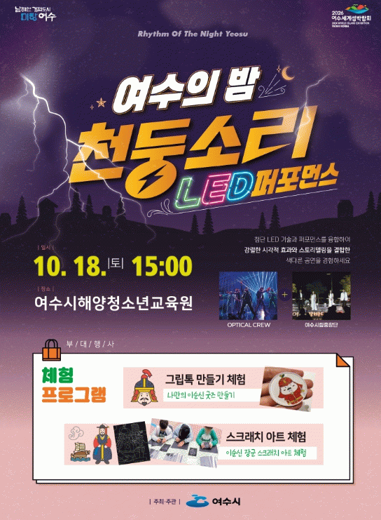 이날 무대에서는 LED 댄스팀 ‘옵티컬크루’의 K-POP 퍼포먼스를 비롯해 여수시립국악단과 시립합창단이 함께하는 다채로운 합작 공연이 펼쳐질 예정이다.