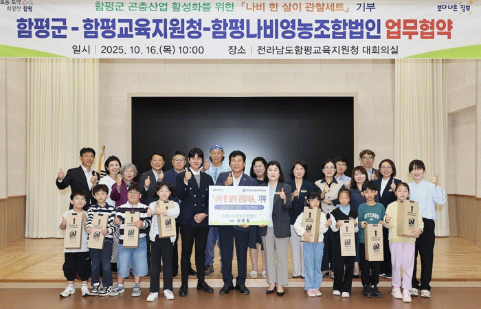 특히, 함평나비영농조합법인은 이날 학생들을 위해 500만 원 상당의 ‘나비 한살이 관찰 세트’ 100개를 기부했으며 앞으로도 매년 기부하기로 약속해 상생 협력의 기반을 더욱 공고히 했다.