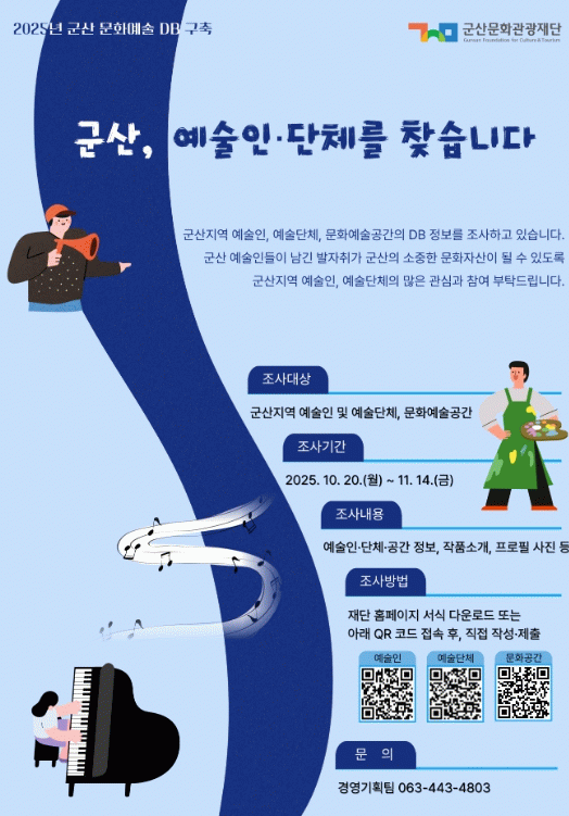 이번 사업은 군산시에서 활동하는 예술인과 예술단체, 문화예술공간의 현황을 체계적으로 조사·정리하여, 향후 재단의 정책 수립 및 사업 추진의 기초자료로 활용하기 위해 마련됐다.