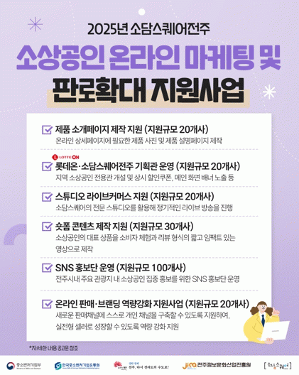 이와 함께 소담스퀘어전주는 소상공인들이 변화하는 온라인 마케팅 환경에 대응하고, 스스로 마케팅 역량을 강화해 자사 제품과 서비스를 효과적으로 홍보할 수 있도록 △숏폼 콘텐츠 제작 지원 △SNS 홍보단 운영 △온라인 판매·브랜딩 역량 강화 지원사업 등도 함께 추진한다.