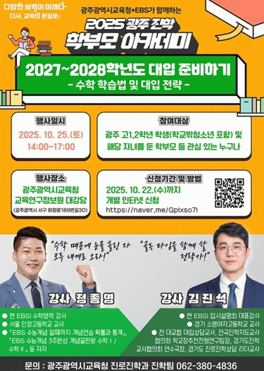 아카데미 참여를 희망하는 학생, 학부모는 오는 22일까지 광주진로진학지원센터 누리집을 통해 신청하면 된다. 당일 현장 접수도 가능하다. 특강은 행사가 끝난 후 EBSi 홈페이지에 탑재될 예정이다.