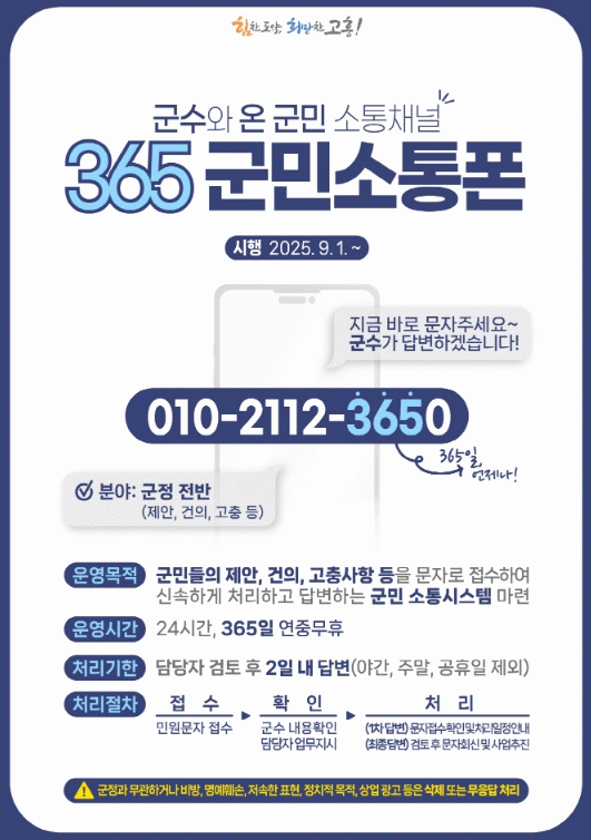 공영민 고흥군수는 “365 군민소통폰은 군민 누구나 쉽게 군정에 대한 의견을 군수에게 직접 전달할 수 있는 열린 소통창구”라며 “앞으로도 군민과의 소통을 일상화하고, 친절과 청렴이 곧 고흥군의 브랜드가 되도록 끊임없이 노력하겠다”고 말했다.