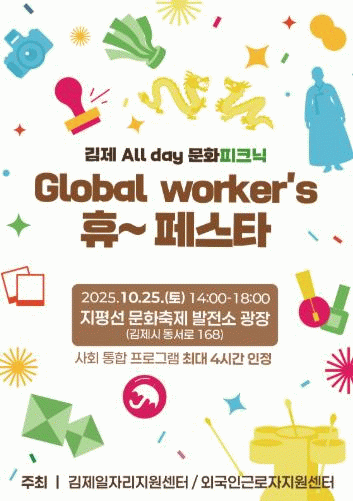 시는 오는 25일 오후 2시부터 6시까지 요촌동에 위치한 지평선문화축제발전소 광장(김제시 동서로 168)에서 외국인근로자와 시민이 함께 어울리는 문화교류 한마당 “김제 All day 문화피크닉 – Global worker’s 휴~페스타”를 개최한다고 밝혔다.