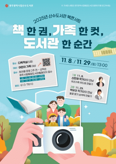 산수도서관을 이용하는 어린이 가족은 누구나 참여할 수 있으며, 참가 신청은 10월 24일부터 광주시립도서관 누리집을 통해 선착순(1회차-8일 15가족, 2회차-29일 12가족) 접수한다. 자세한 사항은 누리집을 참고하거나 산수도서관으로 문의하면 된다.